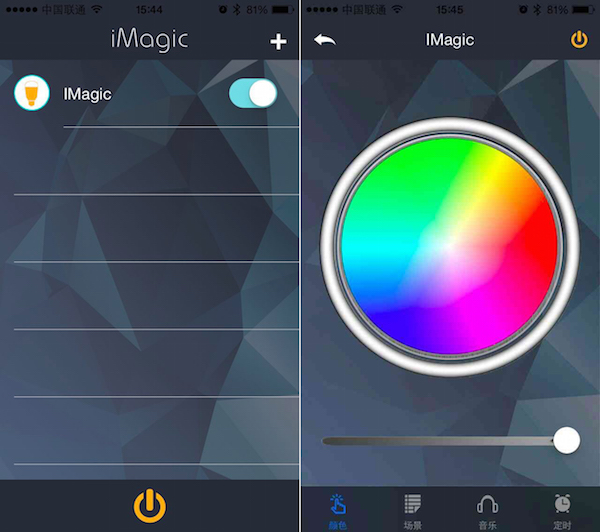 操作界面分為顏色、場景、音樂、定時。在顏色界面用戶可以選擇任意喜歡的顏色,界面下面可以調(diào)節(jié)當前顏色的亮度。